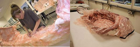 這樣即可為揚聲器的外形制成固化的外殼。然后將芯料(這里是巴沙木)裝入外殼的內表面中,再重復整個裝袋和固化過程。 然后再在巴沙木芯表面添加碳纖維外殼,形成夾心結構。
