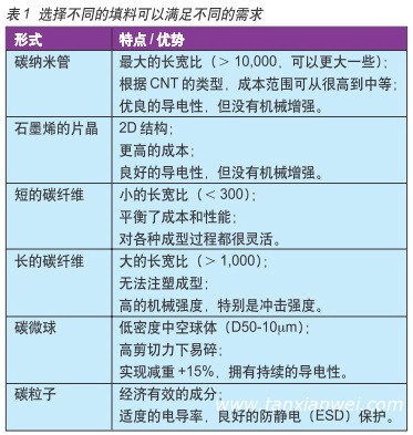 碳的加入可以是多種形式:作為碳納米管(CNT)、石墨烯的片晶、短或長(zhǎng)的碳纖維、碳微球和簡(jiǎn)單的碳粒子。表1總結(jié)了這些形式各自的優(yōu)勢(shì)。這些填充材料使塑料可以導(dǎo)電,以提供EMI屏蔽。大部分CNT填充塑料的電阻率能小于10嗎?以厘米計(jì),在1%至5%的填料體積和1以下?以厘米計(jì),填料體積在5%至10%。有時(shí)候,可以通過碳系填料金屬涂層來增加導(dǎo)電性。