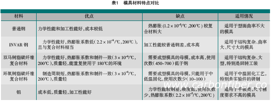 用作復合材料成型模具的材料主要有普通鋼、INVAR鋼、復合材料(雙馬和環(huán)氧樹脂)、鋁等。通常根據(jù)材料的性能(主要是高溫下的熱膨脹系數(shù))、成本、周期及使用次數(shù)來選擇,見表1。 123,123