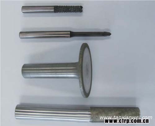 上面的兩個是通過CVD(化學氣相沉淀)涂布了金剛石的超硬合金立銑刀,屬于市售工具。下面兩個是電沉積了金剛石砂粒的工具,是在工具廠商協助下自制的工具。