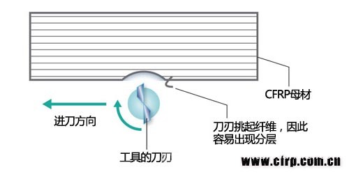 2]工具的旋轉和進刀方面,加工CFRP特別需要注意的是工具的旋轉方向和進刀方向。因為由預浸材層疊而成的CFRP具有各向異性。