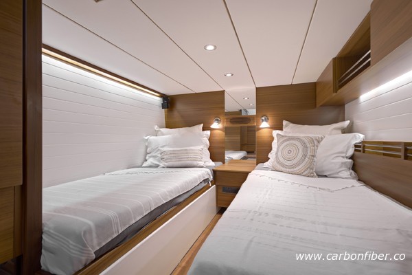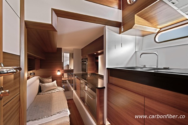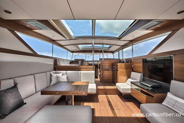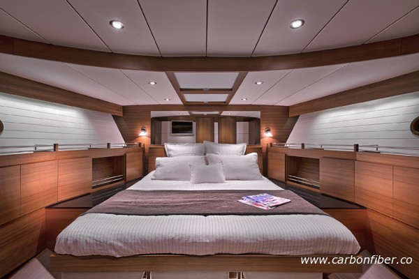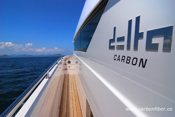 據了解,目前市場上很多船都標榜“碳纖維”,但事實上大部分都只有小區域用了碳纖維而其他區域只是一般的纖維組合。Delta 54 是全球第一艘100%使用碳纖維的游艇,除了船體外,室內柜子門、隔艙板及地板等附屬設施均由碳纖維打造。