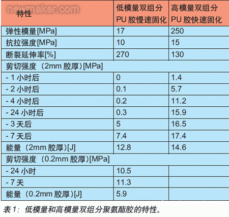 在汽車組裝過程中粘結部件時,雙組分聚氨酯結構膠比較合適。這種膠可以加工成具有不同模量和斷裂伸長率。表1列出了兩種硬化率不同、彈性模量有低有高的雙組分聚氨酯結構膠的性能曲線。