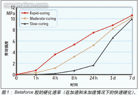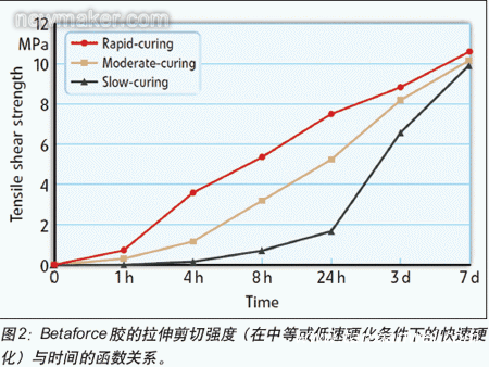 在標準氣候條件下,兩小時后沒有達到該拉伸剪切強度值。但是在加速條件下,1小時候即測得了達3.5MPa。樣本儲存于室溫條件下,強度僅為0.7 MPa。三天后,采用加速膠黏劑,達到了最終強度10.5MPa,而未經加熱反應的樣本,在7天后方達到該強度。