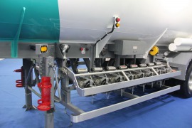 四軸鋁合金油罐半掛一下吸引住了小編的眼球,繞車一圈該車在設(shè)計(jì)上與國(guó)內(nèi)車型明顯不同,經(jīng)詢問(wèn)該車主要出口馬來(lái)西亞,泰國(guó)等,還值得一提的是該車也配了輪胎緊固標(biāo)。