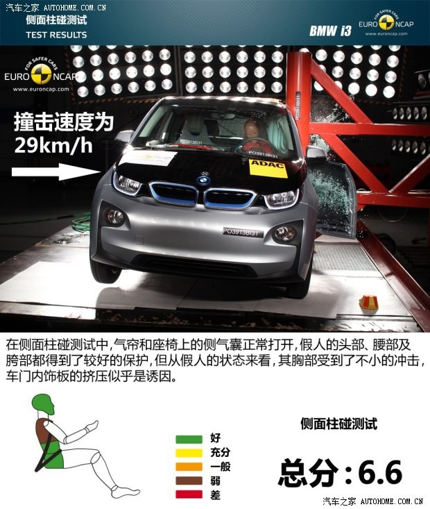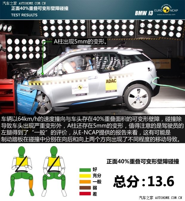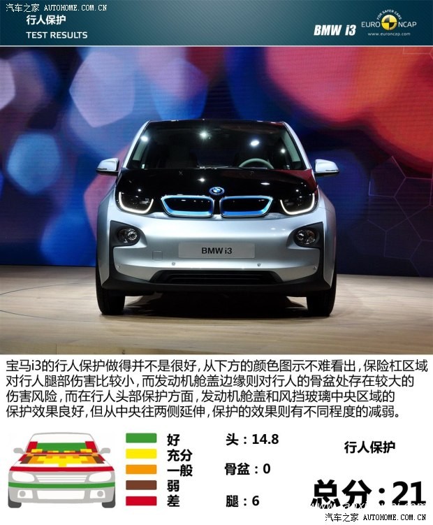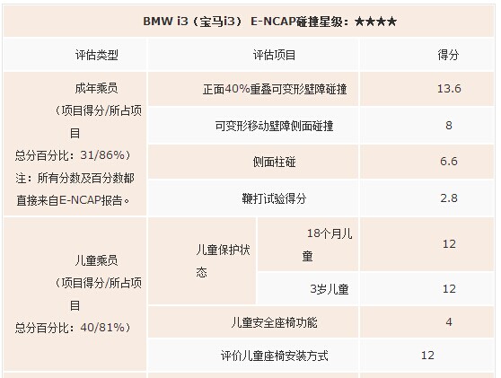 寶馬i3之所只拿到四星的成績,很大程度上都是因為這款車在行人保護(hù)和主動安全系統(tǒng)兩項評估失分較多,其中,行人保護(hù)測試中針對骨盆的評價和主動安全系統(tǒng)測試中有關(guān)速度輔助系統(tǒng)的評估都沒有得分,這導(dǎo)致兩項測試的得分均只拿到總分的一半。