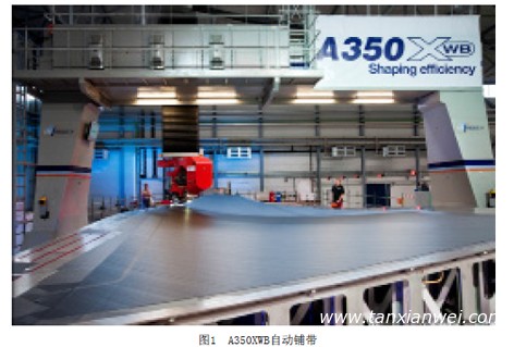 自動鋪帶主要適用于尺寸較大,曲率較為平緩的機翼、尾翼等翼面類結構。經過40多年的發展,自動鋪帶技術在歐美國家已經成熟,并大規模應用于航空復合材料結構件的制造,如波音777飛機機翼、水平和垂直安定面蒙皮,C-17運輸機的水平安定面蒙皮,波音787機翼蒙皮,A330和A340水平安定面蒙皮,A340尾翼蒙皮,A380的機翼蒙皮和安定面蒙皮,A350機翼蒙皮和中央翼盒,A400M機翼蒙皮等。A400M機翼大梁采用的是自動鋪帶加熱隔膜成型工藝。圖1為A350XWB自動鋪帶設備。 123,123