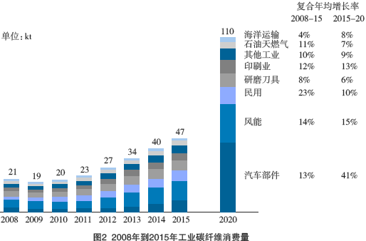 2010年,包括體育休閑和宇航在內(nèi)的工業(yè)應(yīng)用大約消耗了總產(chǎn)量31000t中的20000t,已占到碳纖維消費(fèi)量的2/3(見圖1)。到2015年,體育休閑消費(fèi)量將超過(guò)7000t/年,同時(shí)工業(yè)消費(fèi)量應(yīng)從20000t/年增長(zhǎng)到47000t/年,到2020年,甚至達(dá)到110000t/年(見圖2)。從中期看,風(fēng)電葉片可能是碳纖維需求的主要?jiǎng)恿Γ鴱拈L(zhǎng)期看,汽車行業(yè)將促進(jìn)碳纖維的需求。僅靠汽車行業(yè)就能改變碳纖維復(fù)合材料生產(chǎn)企業(yè)的面貌。 本文來(lái)自123