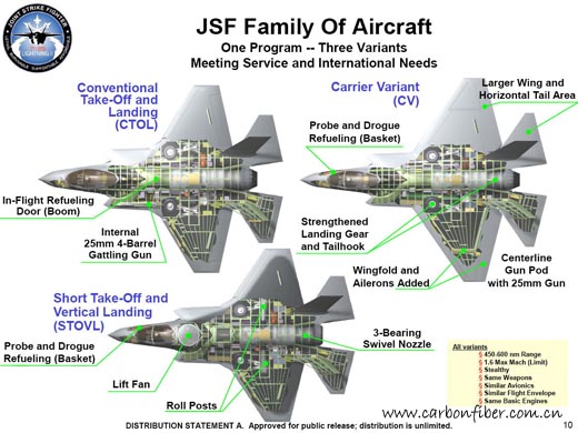與空對空F-22戰機不同,F-35是一種多用途戰機。將對空對地攻擊基于一身。因此美國飛行員不得不掌握更為先進的駕駛技術。F-35有三個不同的版本:F-35A常規起降型(CTOL)、F-35B短距起飛垂直降落型(STOVL)以及F-35C艦載型(CV)。這款多用途戰機的強大攻擊力足以取代美軍中的F-16, A-10, AV-8B 和F-18戰機,以及英軍中的the Sea Harrier和GR.7戰機。F-35的出現,能夠使美軍目前的F-22和F-18E/F船隊得到有效補充。而從制造業角度來說,F-35三種版本,其中至少有20%在設計上是相同的。由此降低了項目設計成本。 本文來自123