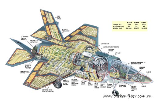 對于戰斗機制造商來說,最大的挑戰莫過于利潤問題。因此,必須在飛機的每個部件,哪怕極小的一個零部件,也要盡量做到成本優化。也許正是碳纖維復合材料成就了F-35戰機:超過35%機身結構件和機體表面都使用了碳纖維復合材料。機身、機翼和尾翼來自不同的供貨商,對于洛克希德公司來說,他們面臨的最大挑戰就如何有效控制機身復合材料蒙皮的厚度。