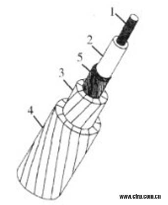 圖2:1、碳纖維環氧樹脂復合材料內芯;2、玻璃纖維增強環氧樹脂復合材料外芯;3、第一層梯形鋁導線;4、第二層梯形鋁導線;5、保護性涂層。 123456