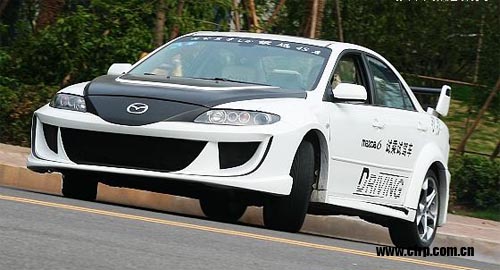 馬自達(dá)6改裝的碳纖維引擎蓋上的兩個(gè)網(wǎng)狀出氣口更是如虎添翼,如同黑馬的兩個(gè)鼻孔。