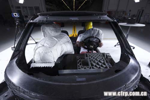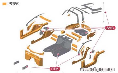 大部分采用預浸料工藝,地板、A柱及碰撞吸能盒采用RTM工藝制成。后部部件采用SMC成型工藝制成。