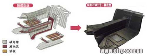 地板部分有10個預成型坯(圖12)。各預成型坯利用專用模具按部品形狀進行局部裝配及預成型。將這些預成型坯、用于吸收側(cè)面碰撞沖擊能量的波板狀部件,以及放入波板中空部的發(fā)泡芯放入模具,然后用RTM成型機注入環(huán)氧樹脂和固化劑。成型時間為45分鐘左右。