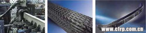由SGL Kumpers負責成型。左起分別為August Herzog公司的編織機、編織物預成型坯、RTM成型品。