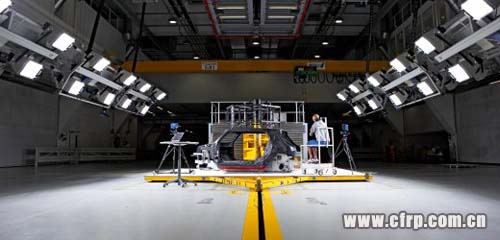 駕駛室是在采用各種方法成型的部件上涂粘合劑,放在夾具上,在爐內(nèi)固化60分鐘使其合為一體。外板方面,采用RTM工藝制成了前部發(fā)動機罩,采用VaRTM工藝制成了CFRP車頂。