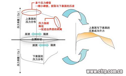 為了防止在馬赫0.7以上的高速區域發生衝擊波,需要控制壓力係數的峰值,但是,為了得到足夠的升力,還需要長時間維持大壓力係數。因此,SHM-1把峰值從一個增加到了多個。