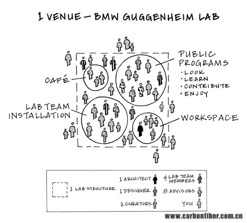 The lower half of the BMW Guggenheim Lab structure is an open space that can be configured to meet the particular needs of the various programs, shifting from a formal lecture setting with a stage to the scene for a celebratory gathering or a workshop. The upper, “toolbox” portion of the structure is loosely wrapped in two layers of semitransparent mesh, which creates a shimmering moiré effect and allows visitors to catch glimpses of the extensive apparatus of “tools” that can be raised or lowered on a rigging system to configure the lower space for the different programs. Remarkably, the BMW Guggenheim Lab is the first building designed with a structural framework composed of carbon fiber. Videos and images of the structure and the construction process can be viewed at youtube.com/bmwguggenheimlab and flickr.com/bmwguggenheimlab.
