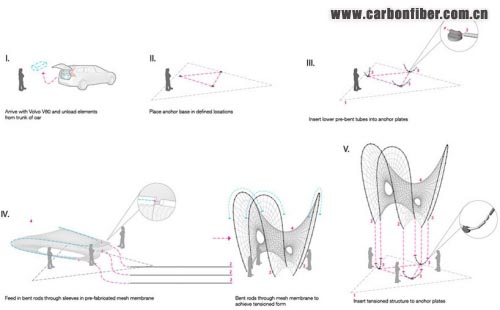 「純張力(PURE Tension)」是由Synthesis Design + Architecture,Buro Happold,和Fabric Images三家公司為沃爾沃的新款混合動力車型V60設計的一款充電車篷,組裝簡單,便于攜帶,采用膜網結構,可以通過車篷上面的太陽能電池板為汽車充電。