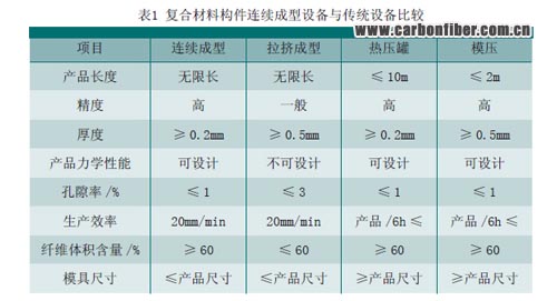 復(fù)合材料連續(xù)成型設(shè)備與傳統(tǒng)成型設(shè)備的比較見(jiàn)表1。連續(xù)成型設(shè)備不受場(chǎng)地和模具的限制,可在小型模具上通過(guò)連續(xù)固化成型生產(chǎn)大型、超長(zhǎng)復(fù)合材料構(gòu)件。另外,該設(shè)備可通過(guò)成型前的自動(dòng)裁剪-鋪疊系統(tǒng),實(shí)現(xiàn)具有鋪層設(shè)計(jì)的復(fù)合材料構(gòu)件的連續(xù)生產(chǎn),這與傳統(tǒng)的拉擠設(shè)備不同,同時(shí)可控制復(fù)合材料構(gòu)件的纖維體積含量。
