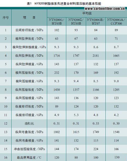 為提高和穩(wěn)定先進(jìn)復(fù)合材料的成型質(zhì)量,降低先進(jìn)復(fù)合材料的制造成本,我們根據(jù)不同的復(fù)合材料結(jié)構(gòu)件研制開發(fā)了中高溫度固化、韌性不同的NY9200環(huán)氧樹脂體 系,原材料均為國(guó)產(chǎn),價(jià)廉易購(gòu);其配制工藝簡(jiǎn)單,質(zhì)量穩(wěn)定,可用于濕法或干法預(yù)浸,無污染,易工程化;其預(yù)浸料具有貯存期長(zhǎng),固化溫度帶寬,固化時(shí)間短等 優(yōu)點(diǎn);其先進(jìn)復(fù)合材料具有韌性和機(jī)械性能兼優(yōu)的特