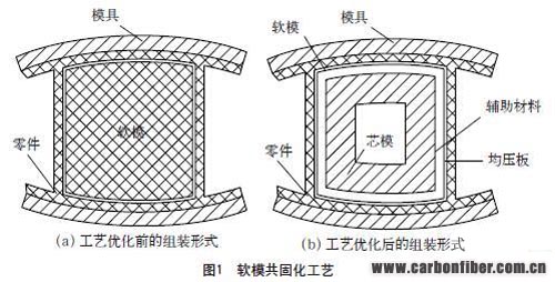 針對(duì)上述問題,我們經(jīng)過反復(fù)試驗(yàn),在工程化生產(chǎn)中不斷改進(jìn),將軟模共固化工藝優(yōu)化為圖1(b)所示形式,利用這種工藝方案連續(xù)生產(chǎn)300多架份的復(fù)合材料產(chǎn)品,質(zhì)量一直穩(wěn)定。