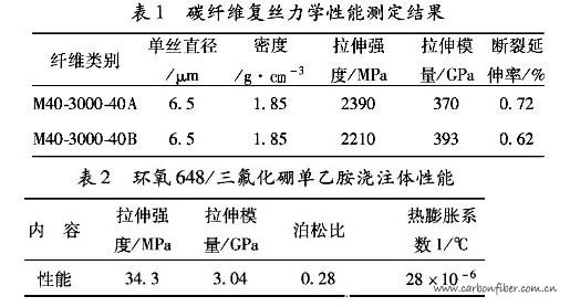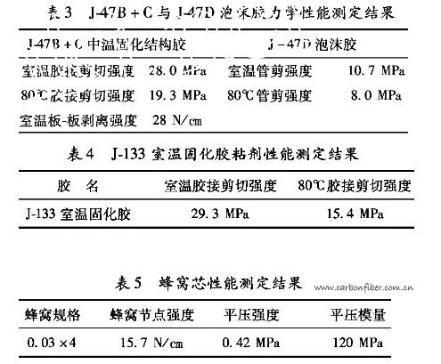 由于天線反射面必須能夠反射電磁波,蜂窩夾層結構復合材料中面板材料必須由導電材料制成。碳纖維具有良好的導電性能,且具有良好的力學性能沿高模量碳纖維軸向的熱膨脹系數為-0.7x10-6/℃,而其垂直于纖維方向的熱膨服系數為23x10-6/℃。它具有明顯的各向異性特點,可通過工藝設計,滿足各種天線反射面的性能要求。實踐表明碳纖維是天線反射面面板材料的理想選擇之一。Kevlar-49纖維同樣具有良好的力學性能,從結構性能角度考慮也是天線面板材料的理想選擇。但由于其不導電,當用于天線反射面時,必須對其反射表面進行金屬化處理。由此可知,天線反射面的結構設計與所用材料性能有著密切的關系。選用不同的材料會使天線反射面的結構特性有很大的差異,為了滿足C波段天線結構的設計要求,在進行了大量的材料性能試驗的前提下,最終選用材料的性能測試結果列于表1至表5中。