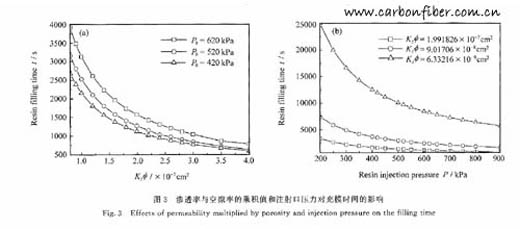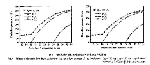 利用復(fù)化辛卜生數(shù)值積分算法和Fortran 99算法語(yǔ)言,對(duì)所推導(dǎo)的理論方程(8)、(9)和(11)進(jìn)行編程和數(shù)值計(jì)算。由方程(11)可知,在樹(shù)脂粘度保持恒定及樹(shù)脂流動(dòng)前沿位置固定的R丁M充模工藝條件下,注射口壓力和三維編織變截面薄壁殼體預(yù)制件滲透率與空隙率(婦的乘積值確定了樹(shù)脂充模溢流時(shí)間的大小。圖3(a)表示在不同注射口壓力條件下滲透率與空隙率的乘積值對(duì)樹(shù)脂充模溢流時(shí)間的影響。圖3(b)表示在不同的滲透率與空隙率的乘積值條件下注射口壓力大小對(duì)樹(shù)脂充模溢流時(shí)問(wèn)變化規(guī)律的影響。圖4表示在注射r1壓力分別為420 kPa和620 kPa的恒壓條件下,三個(gè)固定位置上(z=100 mm,z2=160 min、=260 mm)壓力理論值p(z1)p(z2)和p(z3)與樹(shù)脂流動(dòng)前沿位置對(duì)應(yīng)關(guān)系曲線。山圖4可知,樹(shù)脂飽和浸潤(rùn)區(qū)」或內(nèi)固定點(diǎn)壓力隨樹(shù)脂流動(dòng)前沿位置遞增而增大。