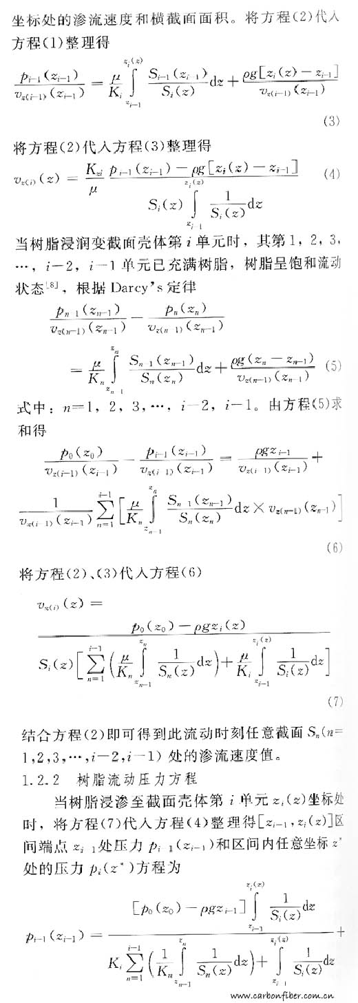 RTM充模的實(shí)質(zhì)是液體樹(shù)脂飽和充滿纖維預(yù)制件孔隙并排除其內(nèi)部所含空氣的過(guò)程。考慮到三維整體編織變截面薄壁殼體的厚度與其直徑和高度相比,數(shù)量級(jí)較小,且薄壁殼體KTM模具樹(shù)脂流道的設(shè)計(jì)一般采用環(huán)線注射結(jié)構(gòu)方式,因此樹(shù)脂充模過(guò)程中的流動(dòng)規(guī)律可近似為多孔介質(zhì)中的一維滲流,即在柱面坐標(biāo)系統(tǒng)(廠,夕,z)中,壓力和速度值僅沿z方向變化。分段一集合計(jì)算方法是根據(jù)制件截面形狀方程的種類數(shù),沿軸線將殼體分成若干單元.利用Darcy分鐘定律依次計(jì)算出各單元段內(nèi)樹(shù)脂流體的運(yùn)功狀態(tài)參數(shù),經(jīng)過(guò)數(shù)學(xué)變換,求得變截面薄壁殼體內(nèi)不同位置的樹(shù)脂流動(dòng)速度場(chǎng)、壓力場(chǎng)、位移場(chǎng)和充模時(shí)間的分布規(guī)律。為簡(jiǎn)化薄壁殼體樹(shù)脂流動(dòng)的理論分析與計(jì)算,作如日限設(shè):充模過(guò)程中三維編織頂制件不會(huì)發(fā)生纖維移動(dòng)和變形;充模過(guò)程中不考慮由于化學(xué)反應(yīng)所引起的粘度變化,樹(shù)脂的粘度值為一定值;充模過(guò)程中僅考慮宏觀樹(shù)脂流動(dòng)現(xiàn)象.慣性和毛細(xì)作用忽略不計(jì);樹(shù)脂注人壓力為Po(zo)。行流動(dòng)前沿處壓力為0.