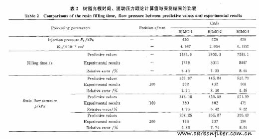 值取決于樹(shù)脂流動(dòng)前沿位置和注射日壓力的大小。為了驗(yàn)證所提出的三維編織變截面薄壁殼體RTM工藝樹(shù)脂充模流動(dòng)分段一集合理論計(jì)算方法的正確性,對(duì)表1所示的三種規(guī)格的三維編織變截面薄壁殼體進(jìn)行了RTM充模試驗(yàn)。試驗(yàn)選用TDE-85/DDS/BF,乙胺環(huán)氧樹(shù)脂體系,以100:15:1.5的質(zhì)最比例混配成所需的膠液,在35分鐘C經(jīng)測(cè)試,樹(shù)脂粘度為428.6 mPa·s(樹(shù)脂粘度測(cè)試標(biāo)準(zhǔn)為GB7193-1),固化后其澆注體密度為1. 302 g/crn分鐘(密度測(cè)試標(biāo)準(zhǔn)為GB 1033-70)。為準(zhǔn)確測(cè)量樹(shù)脂充模溢流時(shí)間,本試驗(yàn)中采用透明有機(jī)玻璃材料加工RTM模具出料口端蓋,并且在模具內(nèi)部相應(yīng)的位置點(diǎn)上安裝壓力傳感器以測(cè)量樹(shù)脂溢流后固定位置上的樹(shù)脂流動(dòng)壓力。樹(shù)脂充模溢流時(shí)間理論計(jì)算值與實(shí)測(cè)結(jié)果的比較、三個(gè)固定位置上樹(shù)脂流動(dòng)壓力理論計(jì)算值與實(shí)測(cè)結(jié)果的對(duì)比如表2所示。由表2所列樹(shù)脂充模溢流時(shí)間理論計(jì)算值與實(shí)測(cè)值的比較值可知:當(dāng)K矛值較大時(shí),樹(shù)脂充模溢流時(shí)間理論計(jì)算值具有較高的預(yù)測(cè)精度場(chǎng)K淤值逐漸減小時(shí),樹(shù)脂充模溢流時(shí)問(wèn)逐漸增大,并且理論計(jì)算值與實(shí)測(cè)值的相對(duì)誤差逐漸增大,這主要是由于過(guò)長(zhǎng)的充模時(shí)間引起樹(shù)脂粘度增加所致。