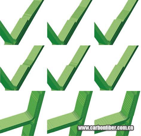 自動建模算法須能根據一系列給定的幾何參數和鋪層參數,為接頭內每一鋪層(包括插層)和每一填充區構建合理的分析網格,同時滿足各鋪層網格相互結合部的節點共有要求。此外,需能準確構建每個單元的材料坐標系。圖4給出通過專門設計的算法,在模擬接頭突緣和突緣區底板內部增減插層對承載能力影響作用的計算過程中,自動生成了部分模型示意圖。
