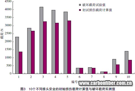 以初始損傷載荷還是破壞載荷來表征接頭的承載能力,也是接頭力學行為模擬涉及的一個具體問題。對破壞載荷的預測不存在特殊的技術困難。實際上,描述復合材料破壞過程的各種算法模型在許多工作中得到應用。但時間耗費是破壞載荷計算的一個主要問題。當分析目標是一個給定的結構案例時,計算時間的影響作用并不凸現。但當分析目標是結構參數變化的影響作用評估或結構方案的優化時,由于涉及大量案例的反復計算,采用破壞載荷作為承載能力表征會使計算時間的耗費變得難以接受。在這種情況下,建議采用初始損傷載荷作為目標函數。初始損傷載荷和破壞載荷分別處于破壞過程兩端,一般情況下兩者之間會存在差異,差異的幅度也隨結構參數和載荷條件的不同而變化。但就結構方案的比較而言,初始損傷載荷的計算值可以切實反映承載能力的優劣狀況。圖3給出一系列不同形式、不同參數、不同載荷形式的接頭案例,由試驗測得的破壞載荷與通過計算得到的初始損傷載荷。從圖3可見,在案例承載能力的橫向比較上,初始損傷載荷計算值和破壞載荷實測值反映了基本一致的優劣態勢。