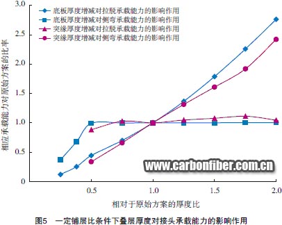 圖5為一原始接頭方案,在給定鋪層比條件下增減其填充區周邊突緣疊層厚度或底板疊層厚度,承載能力所受影響作用的模擬結果。可以看到,接頭結構參數在一定范圍內變化可對承載能力形成顯著影響,并且影響作用會隨載荷形式的不同而發生明顯差異。由于本文的綜述性質,此處不對影響作用的具體細節進行討論,僅通過圖例表明其復雜性。同時表明,對于接頭的合理設計,模擬結果可提供方向性的參數修正依據。