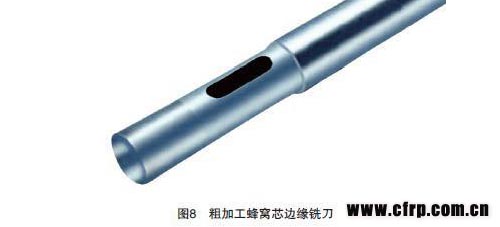 如HSS Hollow CoreCutters刀具,該款刀具被設計為垂直切斷蜂窩芯的晶格,產生一個蜂窩芯未被壓倒的、整齊的邊緣。蜂窩邊緣經過整齊的切割后,再使用一般切割蜂窩的無齒銑刀,將蜂窩自根部割斷,徹底分離,此刀專用于在蜂窩上加工出深槽,并能高效率地去除大余量及切割出整齊的蜂窩芯邊緣。如圖8所示。還有加工飛機壁板的槽銑刀,這種組合式刀具是用于飛機內飾面板蜂窩夾層的開槽,以便于灌注混合體,加固板的邊緣。刀具帶PCD 切割刃,可嵌以金剛石或高速鋼材料,以螺絲固定。如圖9所示。
