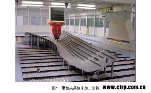 下面介紹一種配備柔性夾具的機床,此機床主要優點是便于對各種形狀的大型復合材料零部件(玻璃纖維、碳纖維、芳綸纖維、Nomex蜂窩芯、鋁蜂窩芯等)的大批量邊緣銑切、制孔、開口等,生產效率高,經濟效益顯著。真空吸盤式柔性夾具系統是一種根據數控鉆銑床發展起來的配套裝夾系統,該系統的主要功能是可在三維空間將彎曲的工件按照預先設計的程序固定好,工件由在TORESMILL龍門設備的工作區域內的真空吸盤固定。TORESTOOL通用支撐夾具可在2min內自動重新配置,從針對一種工件的配置轉換成適應另外一種形狀工件的配置。特別適用于壁板零件的外形和孔的加工。因為避免了大量銑切夾具的制造和存放,可顯著降低成本并節約生產面積,從而被國外航空企業廣泛使用。國內哈飛、西飛、成飛等廠也已引進。如圖1所示。