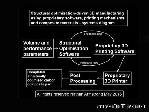 據Armstrong介紹,他正開發的技術采用一種專有工藝,這種工藝采用6軸3D打印機可以以任意角度打印,并使用最適合這種機器的熱塑性增強碳纖維長絲,制造最終的連續纖維結構體。該系統還可以將多個零件聯接成一個更復雜的部件。此外,額外的打印頭可以同時進行拼接和纖維編織。