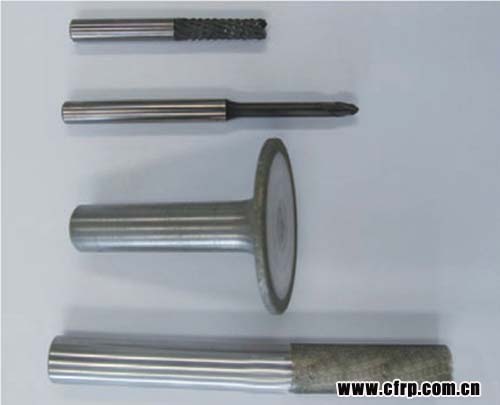 上面的兩個是通過CVD(化學氣相沉淀)涂布了金剛石的超硬合金立銑刀,屬于市售工具。下面兩個是電沉積了金剛石砂粒的工具,是在工具廠商協助下自制的工具。 本文來自123