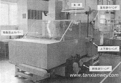 玉川工業(yè)公司開發(fā)了高精度的CFRP大型板材的切斷裝置,可加工厚度200mm、寬200mm、長1.2m的板材,該切斷機有7大特點:①將4角支撐組合起來,并裝備采用密閉式的無油心軸,使偏差和耐久性獲得飛躍式提高,并實現(xiàn)免維修;②隨著主軸剛性的提高,可搭載1.5kW的馬達。③由于砂輪頭和工作臺可以旋轉(zhuǎn),可一次裝卡而同時進行垂直和平行加工;④通過控制變換器調(diào)整切速改進容量,可自由選擇切速;⑤提高工作臺前后動作部件的剛性,而且前后的輸送罩采用可動式,以防止雜物進入;⑥全軸可決定高精度的位置;⑦為保持柱子的剛性,采用兩端支柱和橫軸滑動梁的門型結(jié)構(gòu)。機械尺寸寬2.3m、長3.2m、高2.15m,重2.5t,外形如圖8所示。